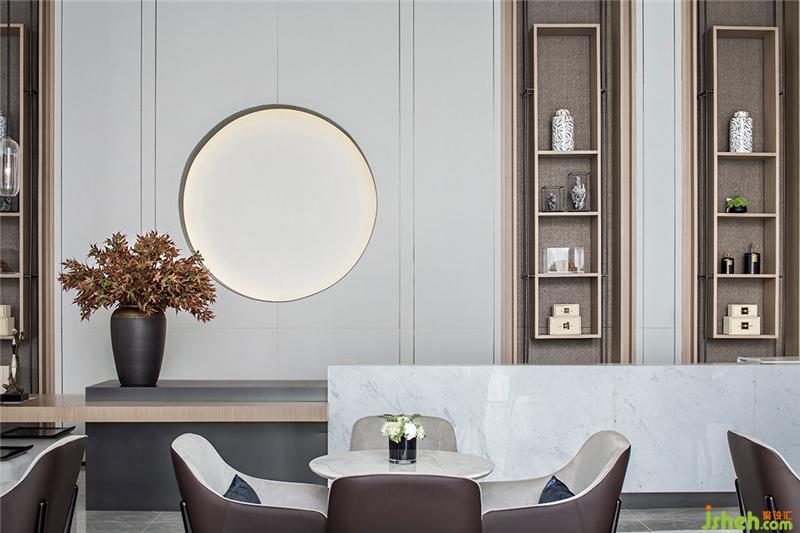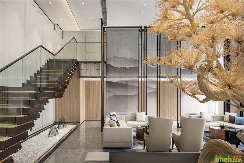 在VIP洽談區(qū),圍合式山水屏風(fēng)造景區(qū)和樓梯下的造景區(qū),同樣采用了枯山水的造景手法,以近于「空無」的枯淡靜寂,呼應(yīng)室外風(fēng)景,給室內(nèi)增添一絲詩意的趣味。會(huì)所設(shè)計(jì)