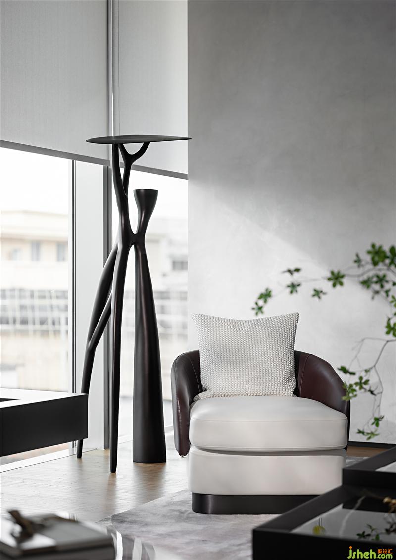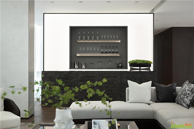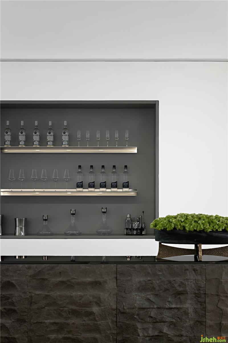 與一層接待臺相呼應(yīng),二層水吧臺同樣運用了天然的原石材質(zhì),粗狂的石材與空間的白色基調(diào)及精致細(xì)膩的珠寶元素形成強(qiáng)烈對比,增加了空間豐富的層次和內(nèi)涵。吧臺上綠植的點綴,讓整個空間更加的靈動和諧。