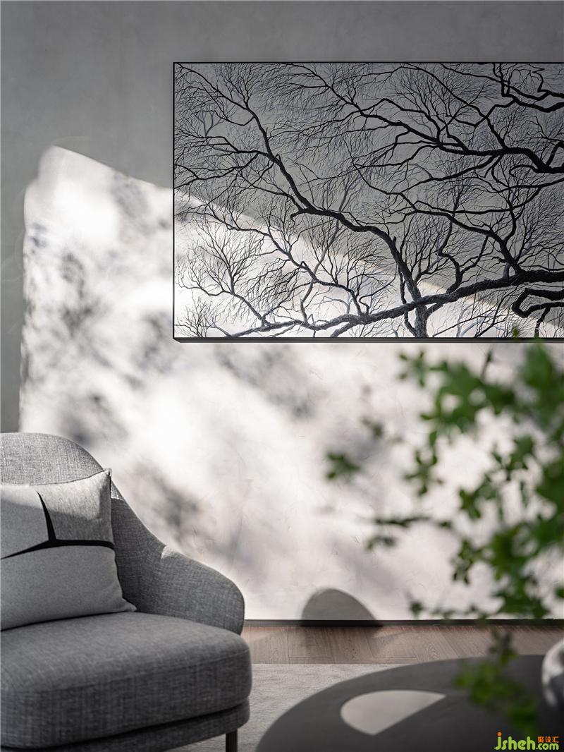 VIP洽談區(qū)在結(jié)合嶺南文化和珠寶文化的基礎(chǔ)上,更注重自然意境的營造。洽談區(qū)與戶外露臺一墻之隔,大面落地玻璃將戶外的景觀延伸至室內(nèi),精致而古樸的藝術(shù)品透過玻璃裝飾柜清晰地呈現(xiàn)于眼前,巨幅黑白裝飾畫上一棵參天大樹與室內(nèi)外的綠植相互映合,虛實(shí)相間,讓空間更加意境幽遠(yuǎn)。藝術(shù)、自然與空間在此完美融為一體。