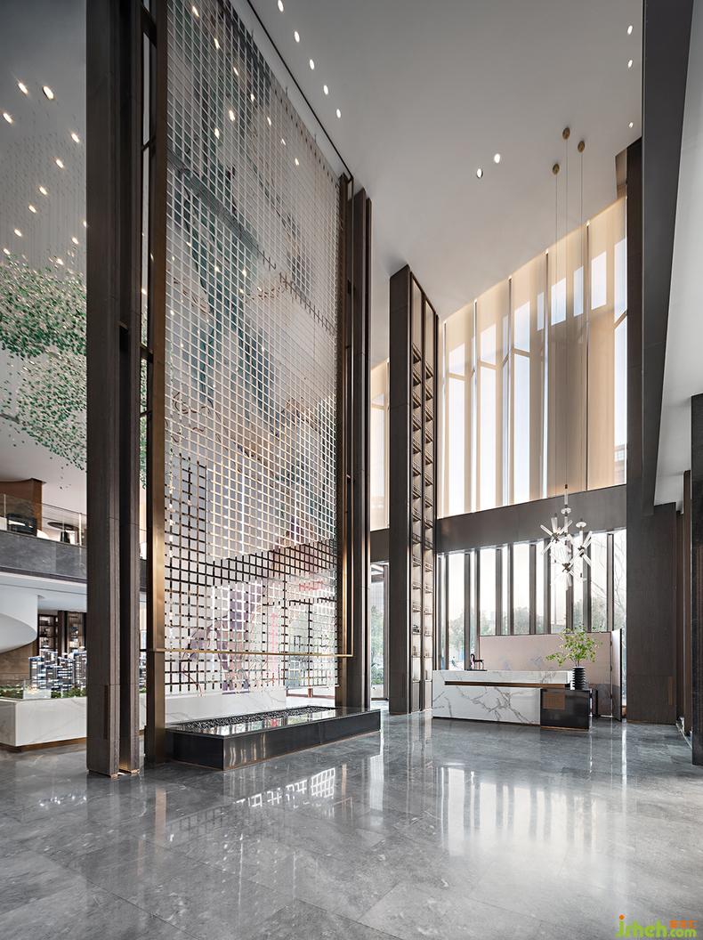 沙盤區(qū)藝術(shù)吊飾由上萬顆不規(guī)則的琉璃石子制成,融入當(dāng)代藝術(shù)之美,綠白相間,銷售中心設(shè)計疏密有致,如煙雨入江南,清新自然的氣息撲面而來。巨幅藝術(shù)裝置上的現(xiàn)代寫意山水,從高處飛流直下,氣勢恢宏。