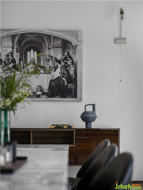 業(yè)主信奉天主教,我們將公共空間更加私密化,綿延《最后的晚餐》,先秦煮茶的風(fēng)俗器具,還原文化中原本的簡(jiǎn)單澄澈,從源頭追溯文化根脈,意境悠遠(yuǎn)。
