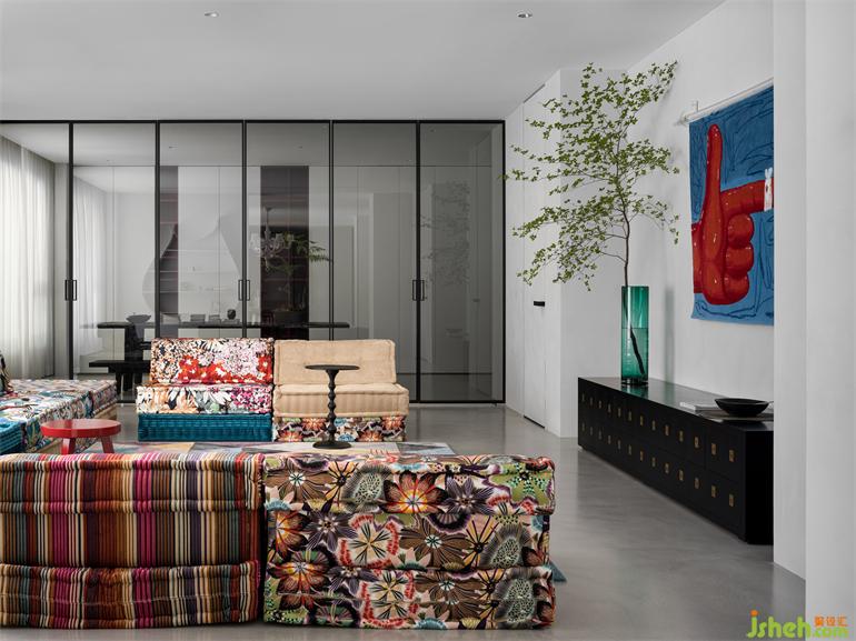 別墅裝飾二樓客廳選擇了意大利產(chǎn),由泰國設(shè)計師Hans Hopfer設(shè)計的可自由組合的”麻將“,你可以把”麻將“并成一組沙發(fā),坐在上面喝個下午茶,亦可以把它平鋪?zhàn)鳛橐粡埓?,睡個午覺。沙發(fā)布料的材質(zhì)花色靈感來源于日本和服,將多元文化融合的概念體現(xiàn)得淋漓盡致。