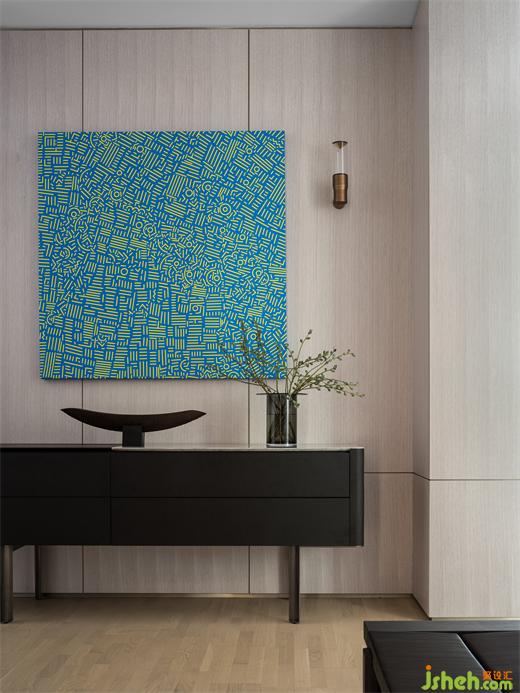 磨砂質(zhì)感的黑色柜子,搭配以抽象藍(lán)色掛畫與古銅色復(fù)古壁燈,別墅裝飾在簡約的基礎(chǔ)上增添的精致與華麗。