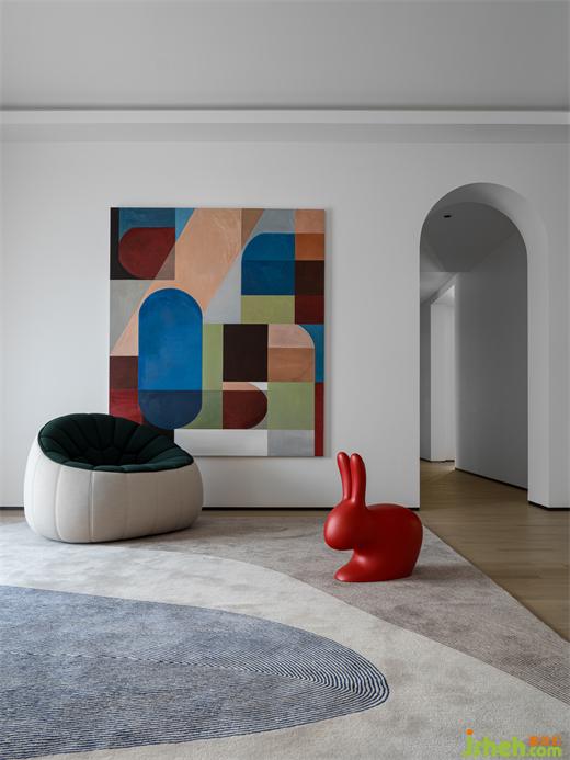 高飽和度的幾何圖形掛畫,墨綠色的沙發(fā),紅色的可愛兔子座椅,莫蘭蒂色地毯,別墅裝飾使靜態(tài)的極簡之家充滿靈動的藝術(shù)時尚感。