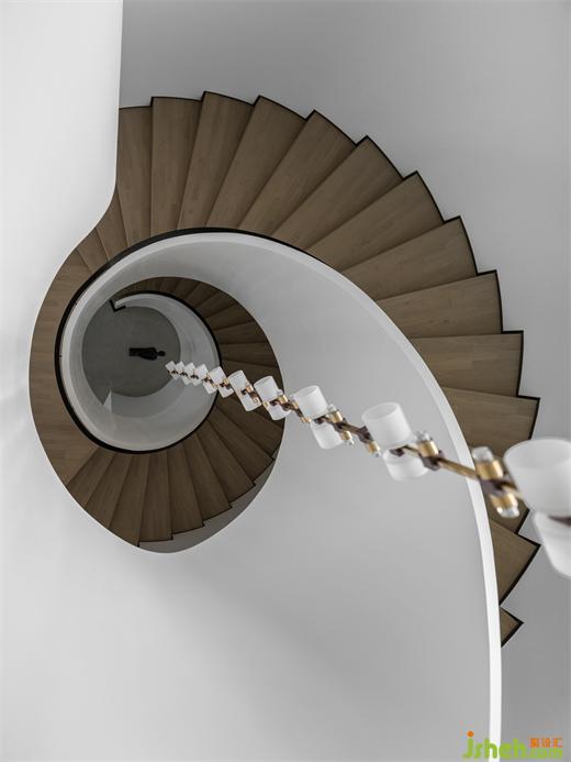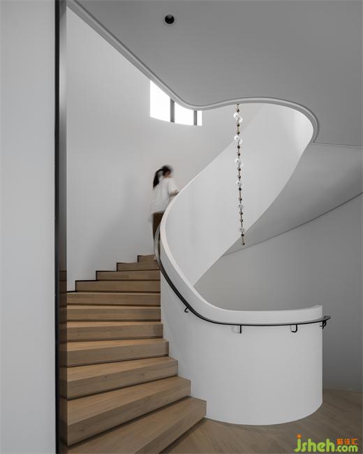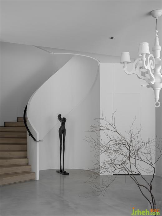 木制的旋轉(zhuǎn)樓梯和純白的墻面,裝飾以黑色的藝術(shù)雕塑和極具造型感的枝條,畫面干凈而高級。樓梯向上延伸,連通著整個家的安寧與溫暖。