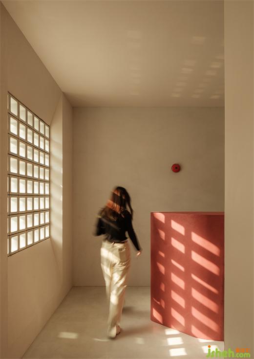 拾級(jí)而上,繞過磚紅色的柱體來到二樓,上海辦公室設(shè)計(jì)被拉長(zhǎng)的網(wǎng)格狀陽光便灑在腳邊。陽光,陶罐,枝葉,帶有歲月痕跡的大小木凳,仿佛穿越回記憶中的童年時(shí)光,沒有煩惱,只有無盡的,無憂無慮的盛夏。一種生動(dòng)的靜謐,帶著回憶沉淀的安寧。