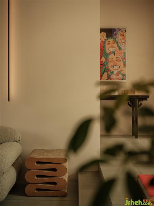 Bright and cheerful colors form a jumping rhythm in the pure white space. The sun rises in the east and sets in the west, and the indoor light changes with time and season. Light and shadow shake gently on the gauze curtain, and the passage of time forms a dynamic aesthetic feeling in the room.