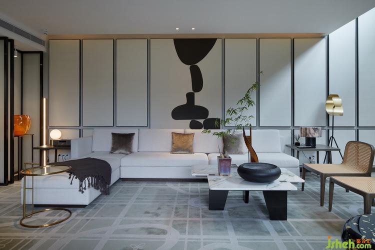 The living room carpet and sofaare in light white tone, such as the rising sun, creating a clear and tranquil atmospherein the room. The reconstruction of the abstract art painting of the background wall reproduces the far-reaching artistic conception of the traditional ink painting and creates a synergistic and heart-warming artistic effect with the elegant and natural furniture.Slender and graceful green plants show thecharm ofupward growth, pebbles on thecarpet makes the pleasant sound. Butterflies dance in the casting in sunshine. The space extends from the rhythm of life and extends in all directions, awaking people's deeper feelings and understanding. Four bright orange decoration artworks highlight the oriental etiquette style in the ordered placement. The embedded glass and paper screen are soft and uniform under the lighting, adding a comfortable and peaceful space atmosphere.