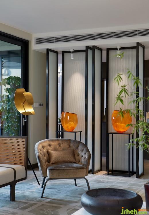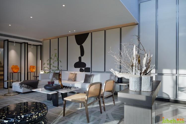 穿過屏風進入餐廚區(qū)域,深木色的廚房空間更像一個藏風聚氣的藝術(shù)館,室內(nèi)設(shè)計師以一種低調(diào)的靜默,達至分明的藝術(shù)性指向。無論是陳列柜上的藝術(shù)品還是藝術(shù)玻璃繪制的巨幅山水畫,都增強了空間內(nèi)在的人文厚度。餐廳吊燈自下而上緩緩而升,提升了垂直方向上的視覺體驗。墻面如葉子般輕輕飛舞的藝術(shù)裝置,鋪設(shè)出曲動飛揚的神采風韻。