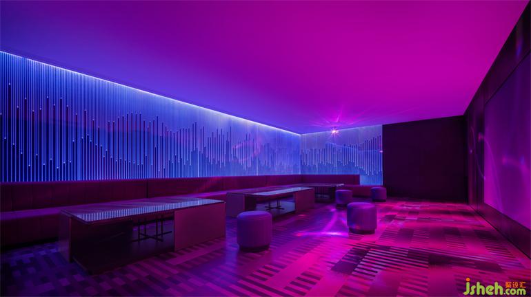 背景墻將“遠山含黛入云煙“的自然美景濃縮于一墻之間。長短不一的水滴狀空心亞克力條,藉由頂部燈光的穿透,光影飄渺起伏。