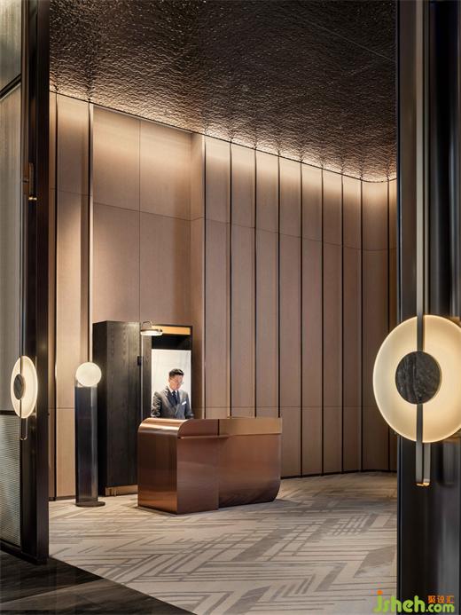 水波紋不銹鋼鏡面天花,于賓客踏入接待區(qū)的瞬間,即產(chǎn)生有趣的對影。酒店設(shè)計(jì)設(shè)計(jì)者對空間的寄望,一一投射于微觀處的精雕細(xì)琢。材質(zhì)考究,光影自成,精致基調(diào)已定,場域一派自在豐盈。