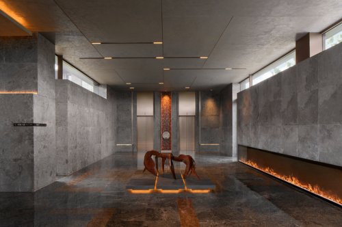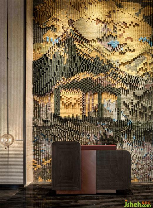 抵達(dá)大堂將青磚黛瓦、園林亭臺(tái)的濟(jì)南傳統(tǒng)四合庭院解構(gòu),酒店設(shè)計(jì)藉由窯變產(chǎn)生細(xì)微差別的多重色澤陶片表達(dá),不同光線不同角度產(chǎn)生奇妙差異化觀感,形成空間第一處記憶點(diǎn),構(gòu)建出極致的、具象的沉浸式歸家體驗(yàn)。