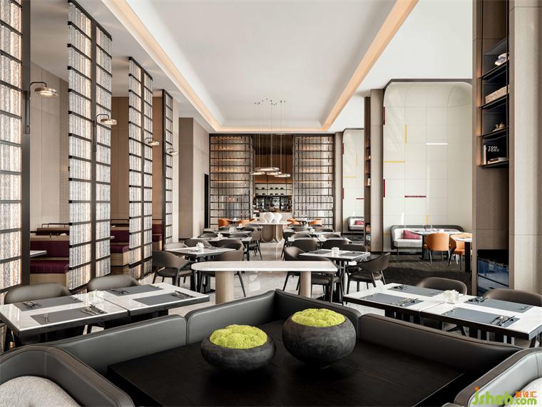 全日餐廳以簡約的筆觸,勾勒無形的豐盈。時光彷彿于精妙的細節(jié)中交疊,從大堂延展至全日餐的陳列架、源自“街燈”形態(tài)的過道壁燈,軟包隔斷墻上似鱗次櫛比店招的錯落亮麗色塊,于可視化的空間中映照出古商埠與新都會交融的圖景和故事。