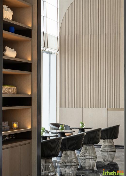 莫道江南遠,江南盡在此間。以江南烏篷船為靈感,酒店設(shè)計從地面延展至頂面的曲面吧臺背景墻,呼應(yīng)頂部天花造型,暖暖燈光傾瀉而出,予人一種暖心的包裹感。