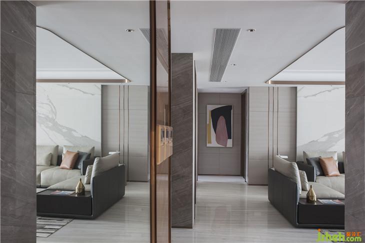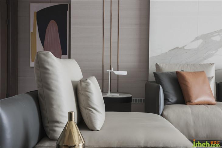 “真正的品質(zhì)生活,期待的是心靈的放松與沉淀,不適合過多的贅述?!痹O計師以此出發(fā),選擇了不爭不搶卻讓人無法忽視的高級灰為主色調(diào),在選材上,巧妙運用內(nèi)嵌黃銅裝飾勾勒輕奢質(zhì)感,并借皮革、大理石、黃銅金屬等多種材質(zhì)的碰撞,營造輕盈而豐盛的基調(diào)。