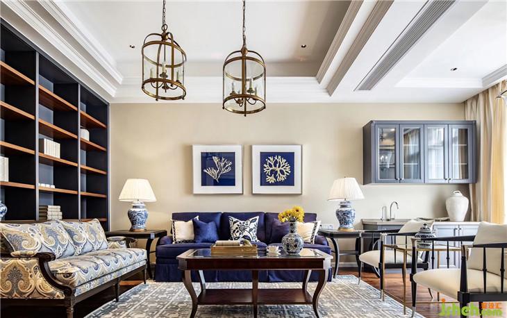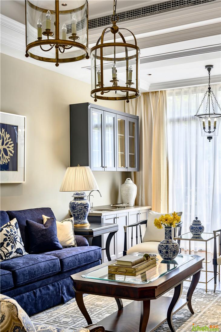 色彩上,寧靜且富有質(zhì)感的灰藍占據(jù)C位,搭配美式家具、復(fù)古造型的吊燈,將空間內(nèi)斂而深刻的美式奢華與優(yōu)雅情調(diào)延展開來。