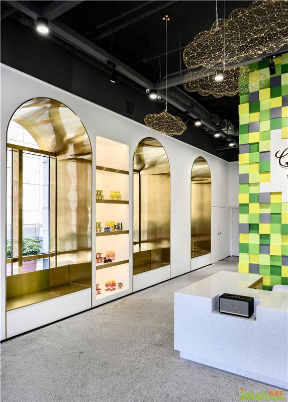 大面積的留白中,材質(zhì)本身的特質(zhì)被充分發(fā)揮出來。展示櫥窗玻璃和金屬元素的組合,地面以統(tǒng)一的水磨石鋪貼,配合頂部的云狀吊燈點(diǎn)綴,在極簡的美學(xué)語境中催生出了浪漫、精致的個(gè)性。