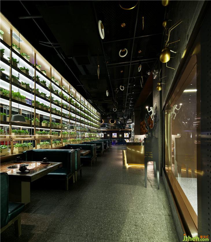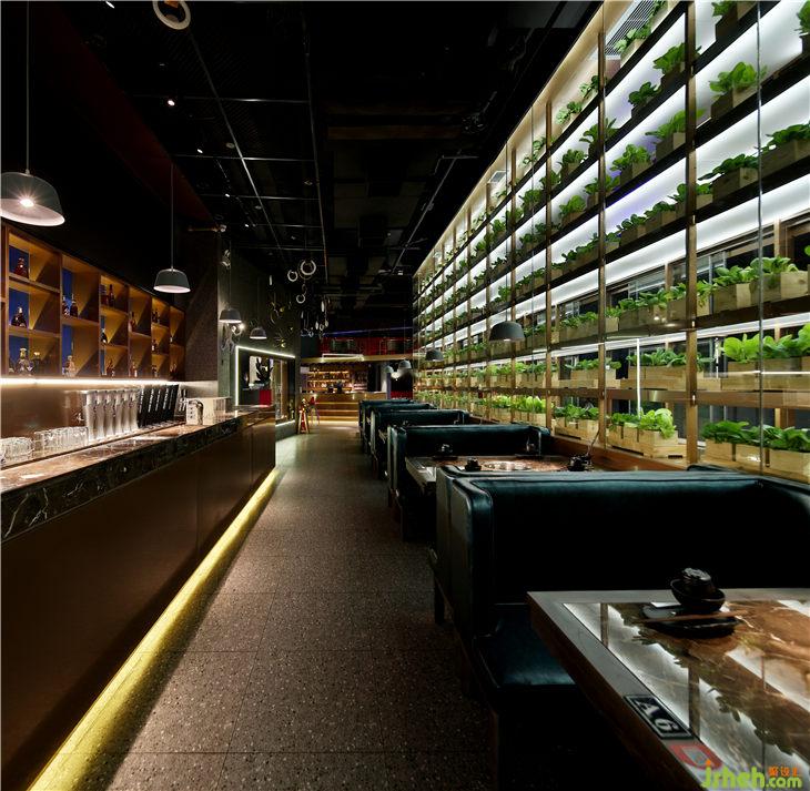 設(shè)計(jì)師設(shè)計(jì)了多個(gè)互動(dòng)打卡區(qū)域,增加了趣味性,同時(shí)還可以吸引更多在店鋪外游走的潛在客群??臻g內(nèi)部,一抹綠色的玻璃幕蔬菜墻與動(dòng)感的燈光與音樂(lè)相互融合,將火鍋與酒吧重新定義。設(shè)計(jì)師將匠心設(shè)計(jì)在選材與配色選取上,曲盡其妙,紅色與墨綠色之間碰撞給人完美的平衡感。
