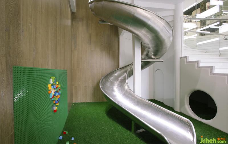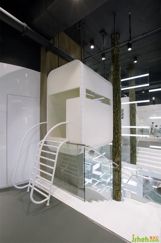 步入大廳,進入眼簾的是最矚目的一條S型滑梯,連接停留在高高樹干上方方正的白色“太空船”。這一小小的青青草地,是孩子們的樂園。放學,從滑梯滑下,穿過時光隧道,見到站在一旁等候父母那一剎那的驚喜。樓梯底下的空間,打造成了穿越小洞,孩子躲貓貓場所。