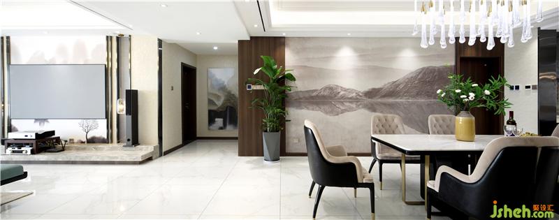客廳與餐廳相鄰無(wú)隔斷,自然光自景觀陽(yáng)臺(tái)落地窗傾瀉而至,為居室鍍上一層暖色光暈,落下滿室溫馨,歲月靜好。餐廳背景則為一副墨色的山水畫(huà),在溫馨燈光襯托下,打造出一副朦朧美的意境。山水融為一體,在含蓄節(jié)制的空間中感受自然的韻律,將自然大美引入生活,尋找生活的本質(zhì),營(yíng)造一種中國(guó)式的優(yōu)雅奢華空間。室內(nèi)設(shè)計(jì)師