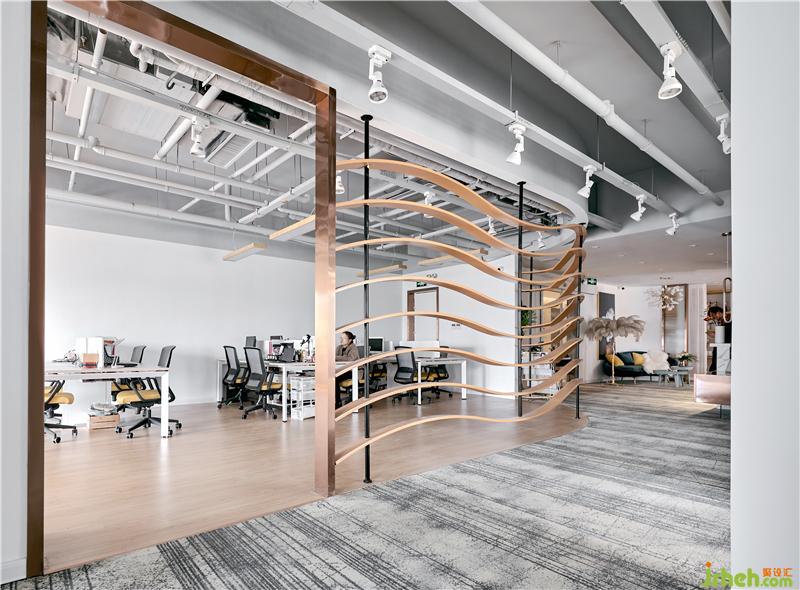 過道走廊作為公共空間的人流動(dòng)線域,直接體現(xiàn)空間的整體品質(zhì),打破了封閉空間的束縛,利用半透明間斷弧形屏風(fēng)隔斷營(yíng)造出虛實(shí)相生的效果,另一側(cè)的藝術(shù)毛羽飄落傳遞出飄逸輕盈充滿時(shí)尚,獨(dú)具浪漫特性。辦公室設(shè)計(jì)