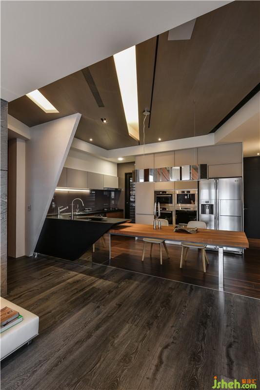 懸浮的餐桌量體,以精密的計算鑲嵌于造型吧臺中,讓餐櫥空間成為一系列流動線條的延續(xù),放大了整體的空間感;配色、材質(zhì)與造型的相互搭配,結(jié)合了展示、收納、起居與創(chuàng)造性的空間關(guān)系,亦為屋內(nèi)迎來了各種超現(xiàn)實色彩的重力感受。藉由曲度、折線、面材對比,打造出具有流動感與故事性的居家空間。