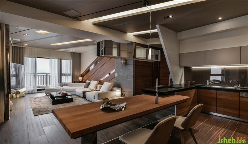 左岸依山傍水,為引入了大量的天然采光與屋外風(fēng)景,客廳以敞開的落地窗連接室內(nèi)外,并將電視懸浮于窗景上,讓戶外風(fēng)景無限延伸。公共空間透過線條的延伸營造出場域的開闊感與廣度,從天花板延續(xù)到長形沙發(fā),讓整個空間產(chǎn)生「內(nèi)在的秩序」,進而制造出空間的張力。利用角度的雕砌與曲線塑造手法,讓整個空間中添增多元面向與穿透感;透過豐富的細(xì)節(jié)使設(shè)計元素相互碰撞、融合并融會于場域之中。將收納柜融入深具藝術(shù)性的墻面中,兼具實用與設(shè)計感,使機能與美感相輔相成。