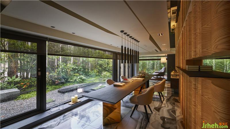 多功能會(huì)議廳采用大面開窗與摺窗的設(shè)計(jì),使外在景觀滲透室內(nèi),打造一個(gè)室外零界線空間,彼此呼應(yīng),讓住戶能輕松自在地沉浸于自然景觀、享受陽(yáng)光的沐浴;室內(nèi)空間利用概念性景觀的設(shè)計(jì)與室外做呼應(yīng),于墻面注入了古典語(yǔ)匯的弧線線條,淡淡地散發(fā)奢華之感;家具、燈飾的材質(zhì)上用了很多不同手法,讓自然與奢華能夠表現(xiàn)性的融合新生。