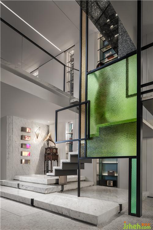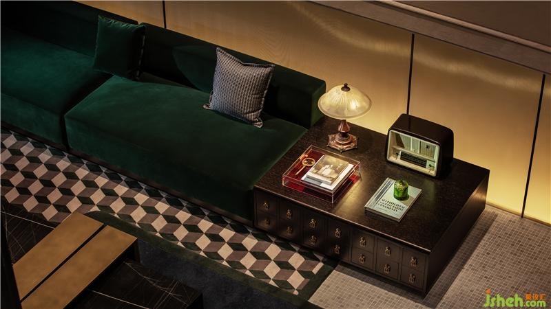 設計師劉榮祿先生奔走于上海、南京、沈陽考察民國時期建筑,沉潛數日,畫出手稿,萃取一組非對稱、幾何形的裝飾線條原型,作為空間最深沉的設計語匯。把歷史底蘊抽取出最原汁原味的部分,每一塊地毯圖案專門定制,立體棋盤格、放射光芒或半圓形色譜,都是Art Deco時代的經典符號。