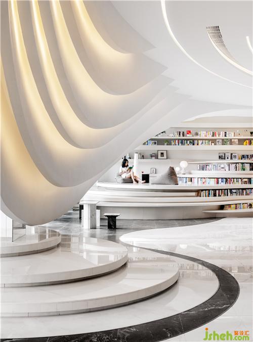 書吧區(qū)靜處一隅,勾畫出一個好似《冰河世紀》般巨大的冰川溶洞中新生的文明世界,又如《侏羅紀公園》模擬而成的遠古地殼運動誕生物,宏大而遙遠。沿墻體一側(cè)自然剖開的流體空間,將每本關(guān)于文明的記載一一陳列期間,強化空間的虛實關(guān)系,似有似無間延伸空間縱深感。