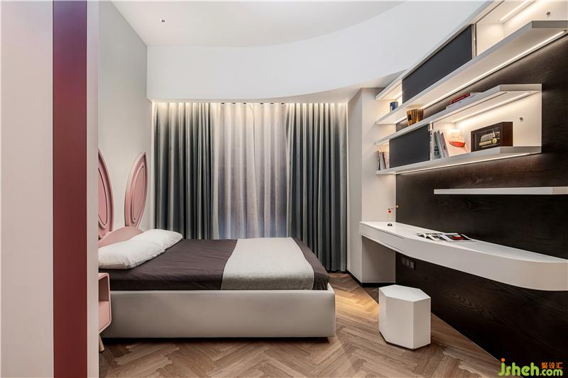 女孩房內(nèi),盈白的安逸世界里,漸入浪漫的藕粉色,并以兔耳作床靠裝飾,深圳豪宅設(shè)計浸潤出極具藝術(shù)氣息的童真空間。曲線勾勒天花板的別樣趣味與藝術(shù)格調(diào),懸浮書柜烘托起盈盈的休憩氛圍。