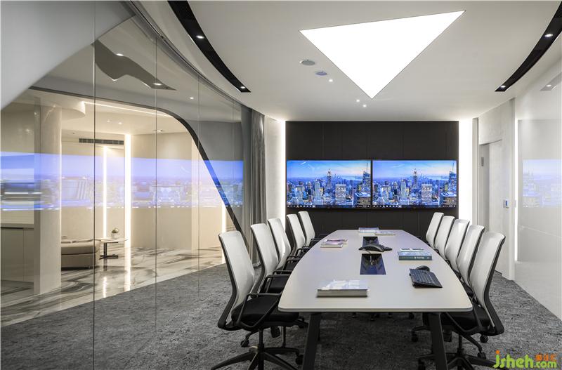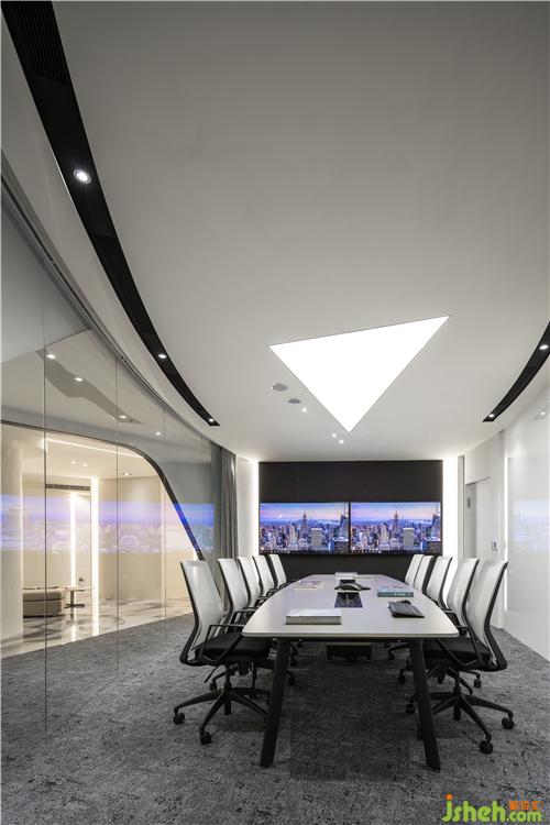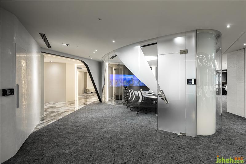 在有限的真實世界里營造出無限的空間感,一個虛擬的精神世界在幾何造型的層層鋪陳下徐徐展開。線條疊合、旋轉(zhuǎn),使空間進(jìn)行組合,實現(xiàn)了場地平面細(xì)分和尺度控制,辦公室設(shè)計將透明弧形玻璃圍合的會議室安排在辦公空間的心臟部位,使訪客員工都能最快進(jìn)入,形成了一個靈動而富于變化的“洄游式空間”。