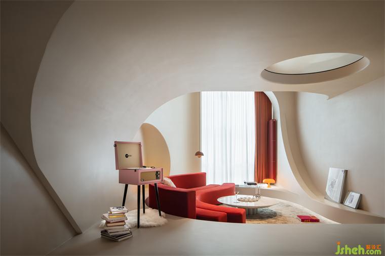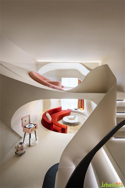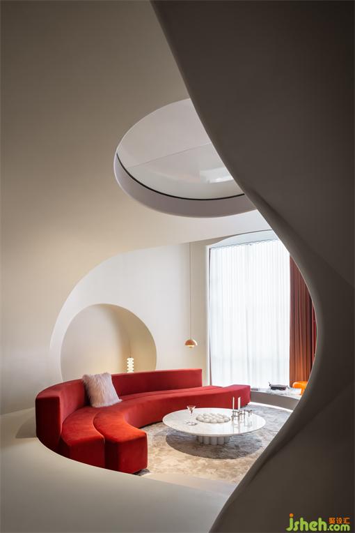 樣板房設(shè)計(jì)弧形沙發(fā)自帶慵懶閑逸的氣氛,或隨意依靠或席地而坐。圓形玻璃在這里繼續(xù)充當(dāng)一二樓之間的功能劃界與情緒脈連,透而不通,聚而不合,為空間憑添獨(dú)特的節(jié)奏感與美學(xué)張力。