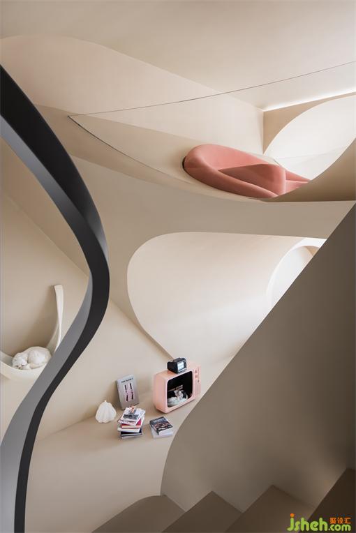 這里是穿越時(shí)空穹廊,抵達(dá)的另一重場(chǎng)域。大面曲線勾勒的置物墻,與一樓穴居空間一明一暗彼此呼應(yīng),像日與夜的輕吟淺唱。樣板房設(shè)計(jì)藉由樓梯的別致設(shè)計(jì)手法,自然劃分二樓動(dòng)靜兩區(qū)的功能空間。也將生活的動(dòng)人細(xì)節(jié),不著痕跡地彌散其間。