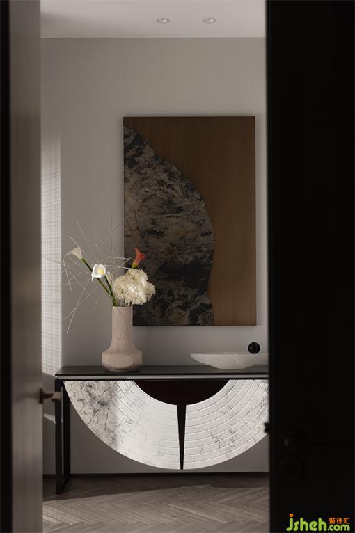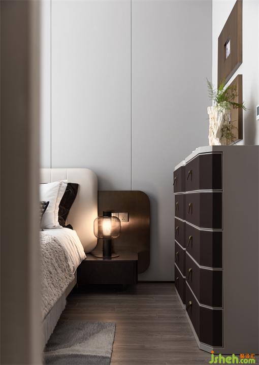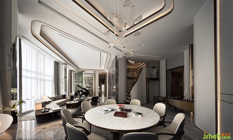 輕盈灑落的餐廳吊燈,自上而下縱向貫穿,為線條感強烈的空間憑添活潑的躍動感。樣板房設(shè)計靈動優(yōu)雅的設(shè)計,柔和了主體材質(zhì)的硬朗感觀,令整個空間的視覺聚焦核心有重點亦有局部細節(jié)的亮點。
