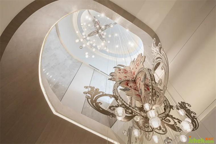 從過廳進入到沙盤區(qū),眼前的景象頓時開闊起來,往上看有美輪美奐的吊燈,往左看有一望無際的窗外美景,往右看有精致優(yōu)美的洽談區(qū)。
