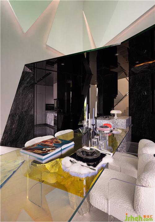 黑白交織的空間里,是空間敘述詩(shī)人的藝術(shù)狂想。秦皇島樣板房設(shè)計(jì)軒敞的挑高層架構(gòu),從天而降的極光燈具,是激蕩又縹緲的視覺(jué)沖擊,是看到歐若拉女神的狂喜悸動(dòng)。藍(lán)冰塊造型沙發(fā)、沙灘極光地毯、慵懶入眠的北極熊、鉆石燈具依次出場(chǎng)。墻面的幾何切割造型,是結(jié)構(gòu)的破壞與重組,打破了既定框架,沖擊既定印象,是屬于解構(gòu)主義的藝術(shù)氛圍,兼俱現(xiàn)代主義簡(jiǎn)約時(shí)尚。