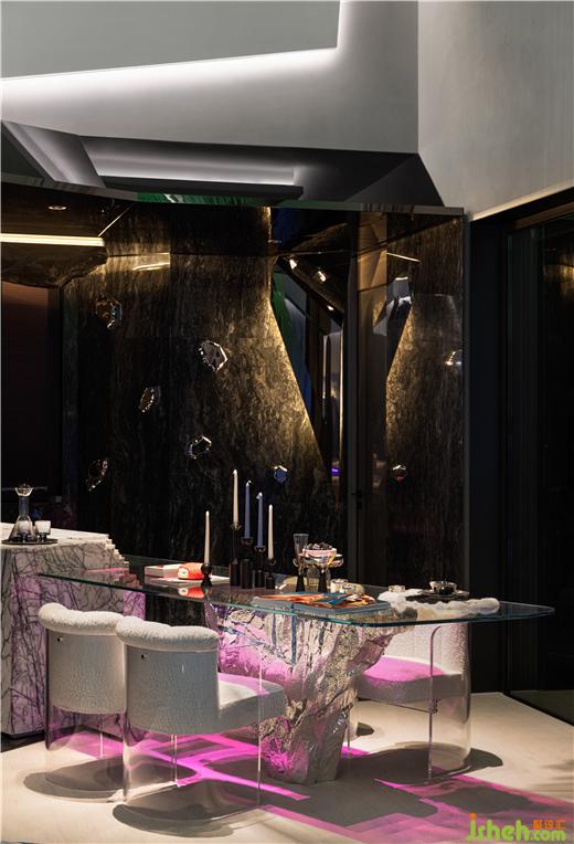 如果說(shuō)客廳區(qū)是冰川、大海和極光,那餐廳區(qū)就是安寧避世的黑沙灘,黑色地面、深灰色墻面,秦皇島樣板房設(shè)計(jì)加上零散分布的剔透冰塊,走近零度曠野的氛圍感迎面而來(lái)。