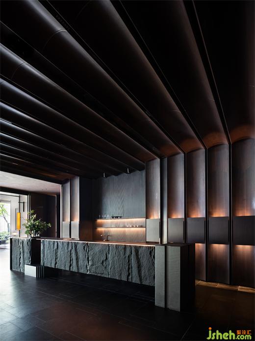 生活館設(shè)計粗糲石材和質(zhì)感豐富的黃銅金屬作為前臺接待臺的主要材質(zhì),粗糲的石材具有獨特的紋理和色彩,能夠為接待區(qū)域增添一種自然、獨特且富有質(zhì)感的美感。