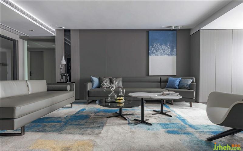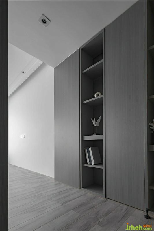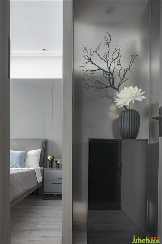 次臥,設(shè)計(jì)師采用深灰色硬包作為背景墻并融入灰色木質(zhì),整體色調(diào)統(tǒng)一柔和。透明的櫥門(mén),左右不對(duì)稱(chēng)的吊燈,使空間層次感提升,帶來(lái)臥室藝術(shù)氣息,也更好的反映了熱愛(ài)藝術(shù)的生活態(tài)度。