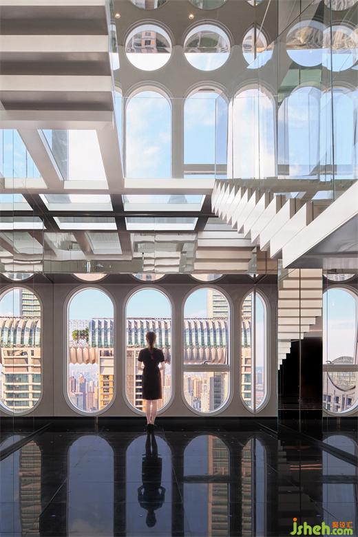 “漂浮”的階梯與來(lái)福士水晶連廊疊印在一起,遠(yuǎn)近,虛實(shí),融合為幻象,失重、游離的感官體驗(yàn)——浮云高空酒店設(shè)計(jì)的基因便是如此。