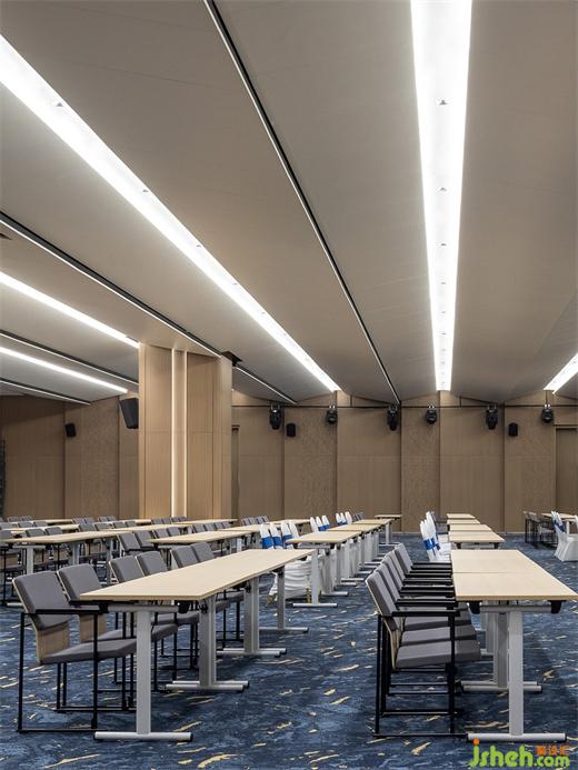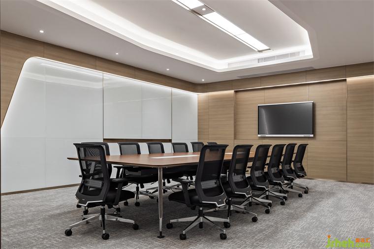 三層智能商務(wù)中心設(shè)置不同大小的會(huì)議室圍繞流線布置,高效的流線便于工作人員使用,考慮到商務(wù)會(huì)議室的使用頻率和具體使用場景,基地總部設(shè)計(jì)規(guī)劃了大會(huì)議室和小會(huì)議室不同體量和容量的場域,應(yīng)對(duì)封閉會(huì)議、獨(dú)立會(huì)議、快速會(huì)議等不同商談場景。同時(shí)簡潔的線條體現(xiàn)企業(yè)科學(xué)和精準(zhǔn)的理念。小會(huì)議室是臨時(shí)會(huì)議、跨組交流的場地,促進(jìn)團(tuán)隊(duì)的高效協(xié)作氛圍。大型會(huì)議室,通過木飾面元素平衡空間中的溫度,簡潔的線條勾勒出空間的塊面秩序,強(qiáng)化了交互洽談場域的獨(dú)特氛圍感。