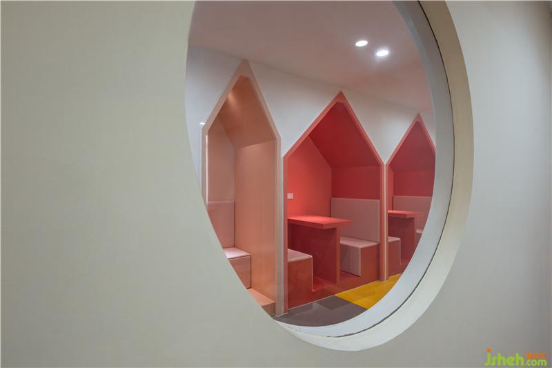 廊道兩旁在橘色和黃色包裹下的讀書屋,孩子閑暇時(shí)間可以在這里學(xué)習(xí)玩耍。彩色學(xué)習(xí)小屋每一個(gè)座椅的邊角全部用皮質(zhì)包裹,安全舒適缺一不可。