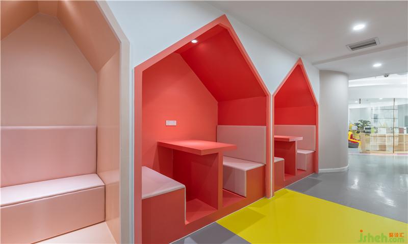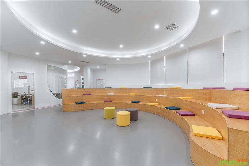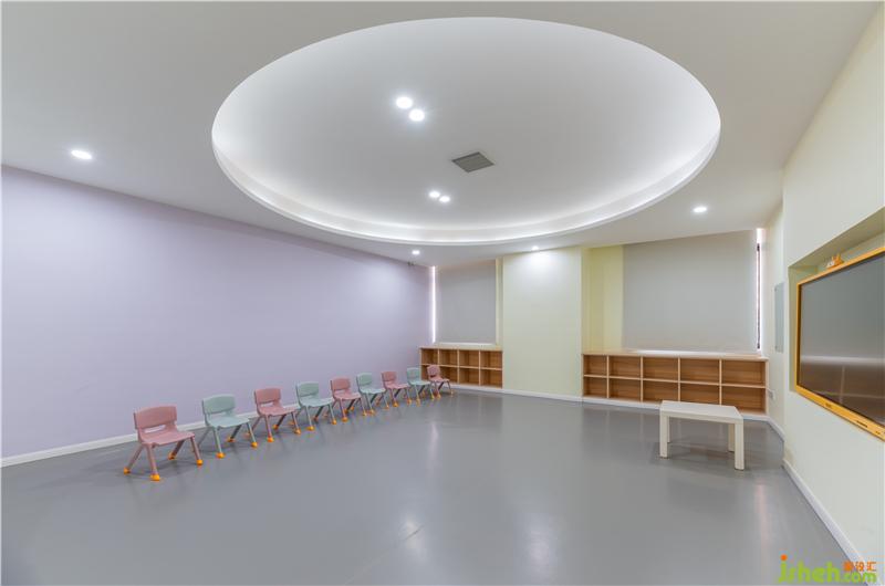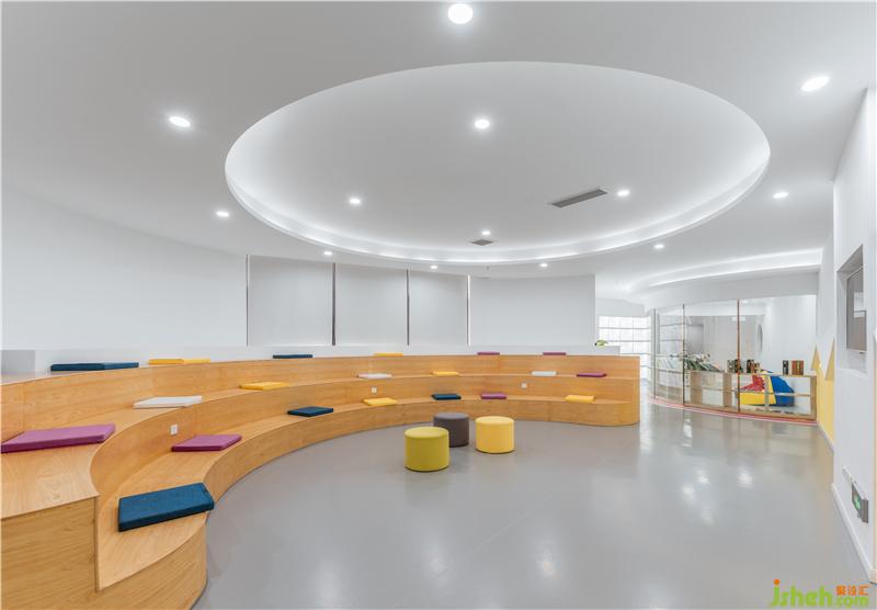 一體式原木色座椅,裝修設(shè)計(jì)點(diǎn)綴各種花色的坐墊,整個(gè)空間就像是流淌的河水,孩子們置身其中,就像自由的小魚兒。房間裝修設(shè)計(jì)中的弧線與座椅的弧線形成完美的呼應(yīng),空間感更大。中間大塊的空地可用作互動(dòng)交流,增加游戲、活動(dòng)、思維拓展等情景式教學(xué)。