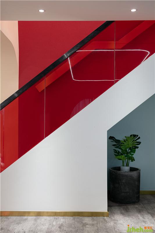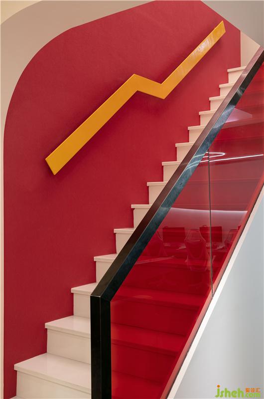 轉(zhuǎn)角的樓梯間的裝修設(shè)計(jì),是整個(gè)空間色彩最鮮艷的區(qū)域。強(qiáng)烈對(duì)比的紅黃色塊,跳躍的顏色和簡(jiǎn)約的線條勾勒出空間靈動(dòng)時(shí)尚的氛圍。