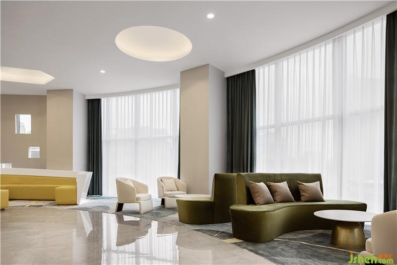 大廳大量采用幾何圖形及弧形元素,簡約而又不失時尚感。以白色為主色調,結合不同的區(qū)域少量點綴金色、橘色、黃色、果綠色元素,讓整體空間氛圍透露著輕奢與溫馨感,滿滿的高級感。