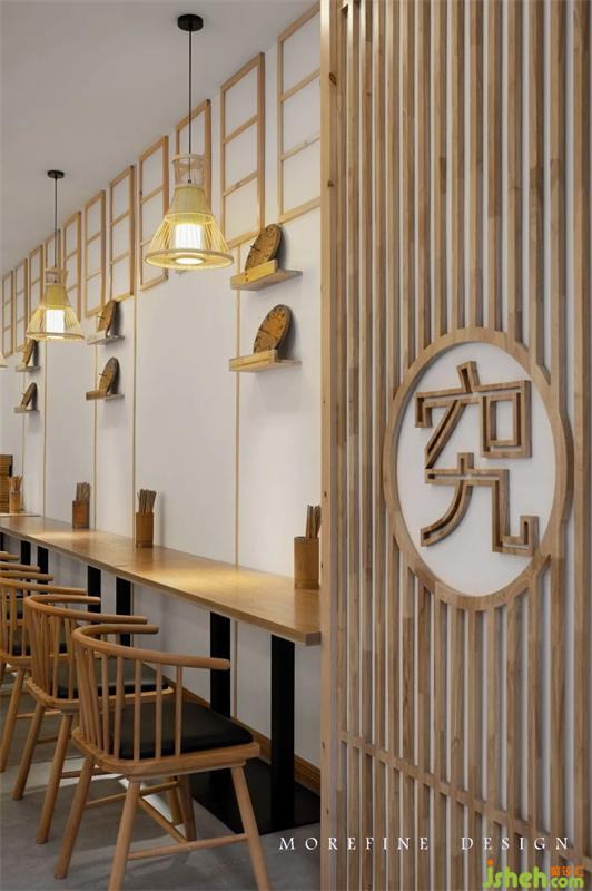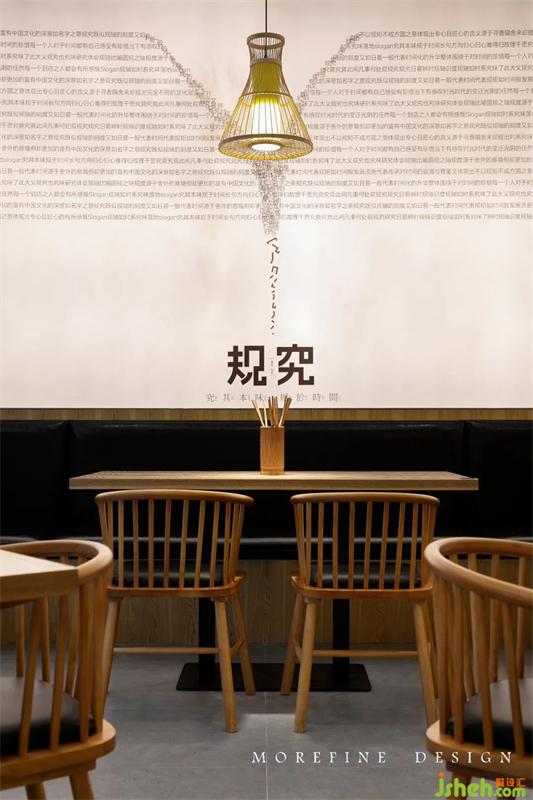 空間餐廳設(shè)計(jì)以瓷白色調(diào)為主,墻面背景飾畫以中文方塊字陣列組合為線條,形似“雁”型展翅,寓意春去東來祥兆如故,由北向南,而獨(dú)愛這一味。