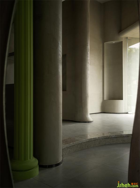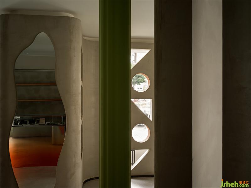 隔離了市儈的招搖,驛動的心被帶入室內。店鋪設計建筑梁結構與不同樓板之間的關系,與幾何構造相互滲透,讓復雜性聚合成一個整體。避免了機械的乖張,故意營造出讓人詫異的破壞性影劇場景,特意手工打造的好幾種斑駁藝術圖案的漆面,在四季白晝的光線中漸隱漸顯,與厚重的幾何體塊幻化交織,迭代出飄渺的神秘效應。