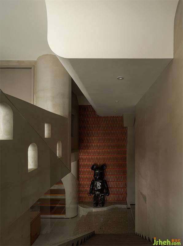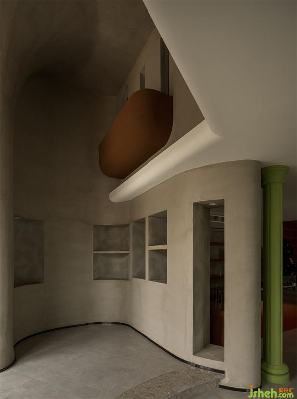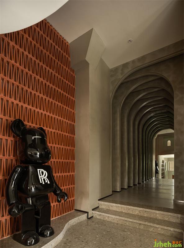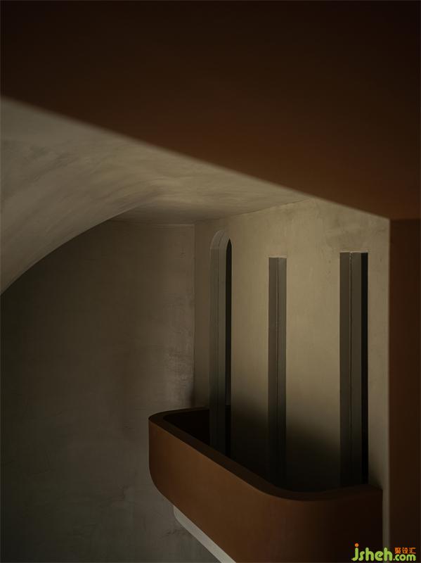 店鋪設(shè)計(jì)在滿足了功能具備的情況下,儲(chǔ)藏室的入口被隱藏在門廊的最深處,層疊交匯的拱門造型里鋪滿了鏡面,造就了拉伸縱深空間的穿越感,跟紅磚造型墻形成強(qiáng)烈的時(shí)空對(duì)話、虛實(shí)互補(bǔ),仿佛在把多維世界的訊息傳達(dá)給人們,追隨流動(dòng)的影蹤蕩滌至遠(yuǎn)端。在不斷變化的光線的幫助下塑造了一個(gè)全新的世界??臻g中星羅棋布散落著淺金色的光暈,仿佛時(shí)間還在流逝,剎那間又停下,那一幀亦真亦幻。