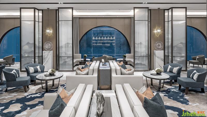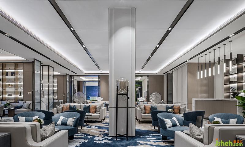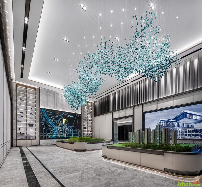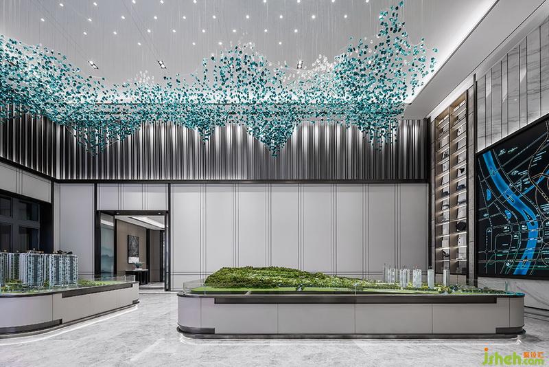 垂墜吊燈裝置,緩解立面關(guān)系的單調(diào),突出中心沙盤區(qū)的視覺聚焦點。溫婉的線條輕盈流動,熠熠生輝,使東方意境在無形之中鋪灑開來。
